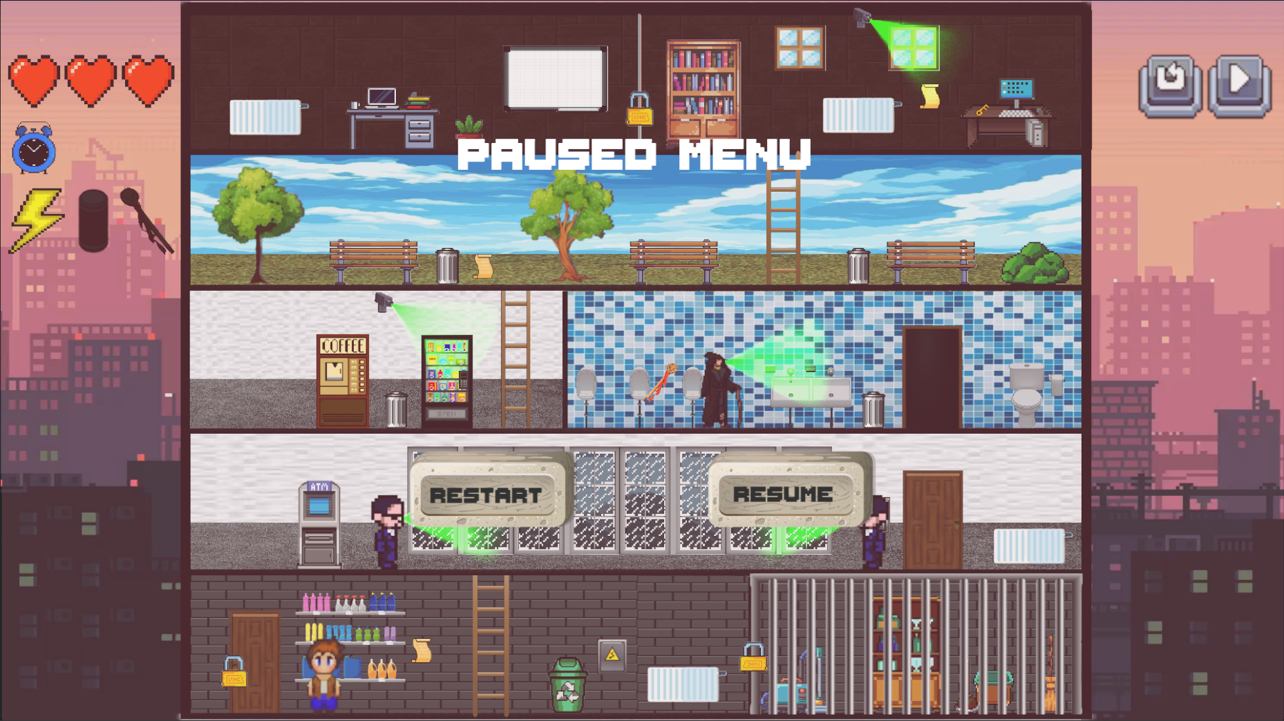 - Enemies - When the player is close to them for 5 seconds, they will arrest him.